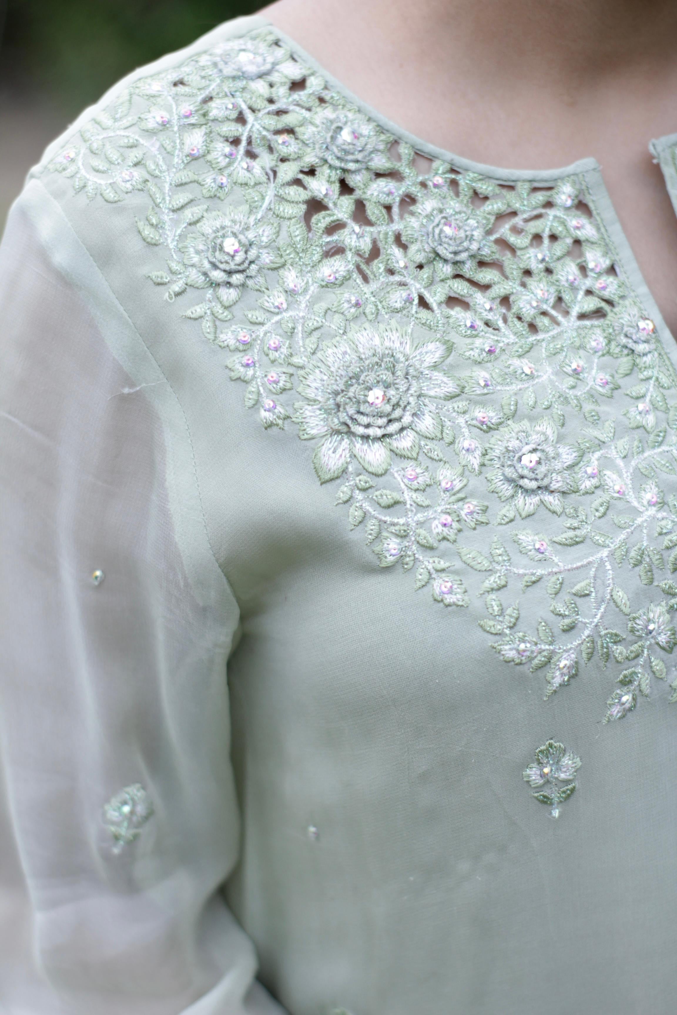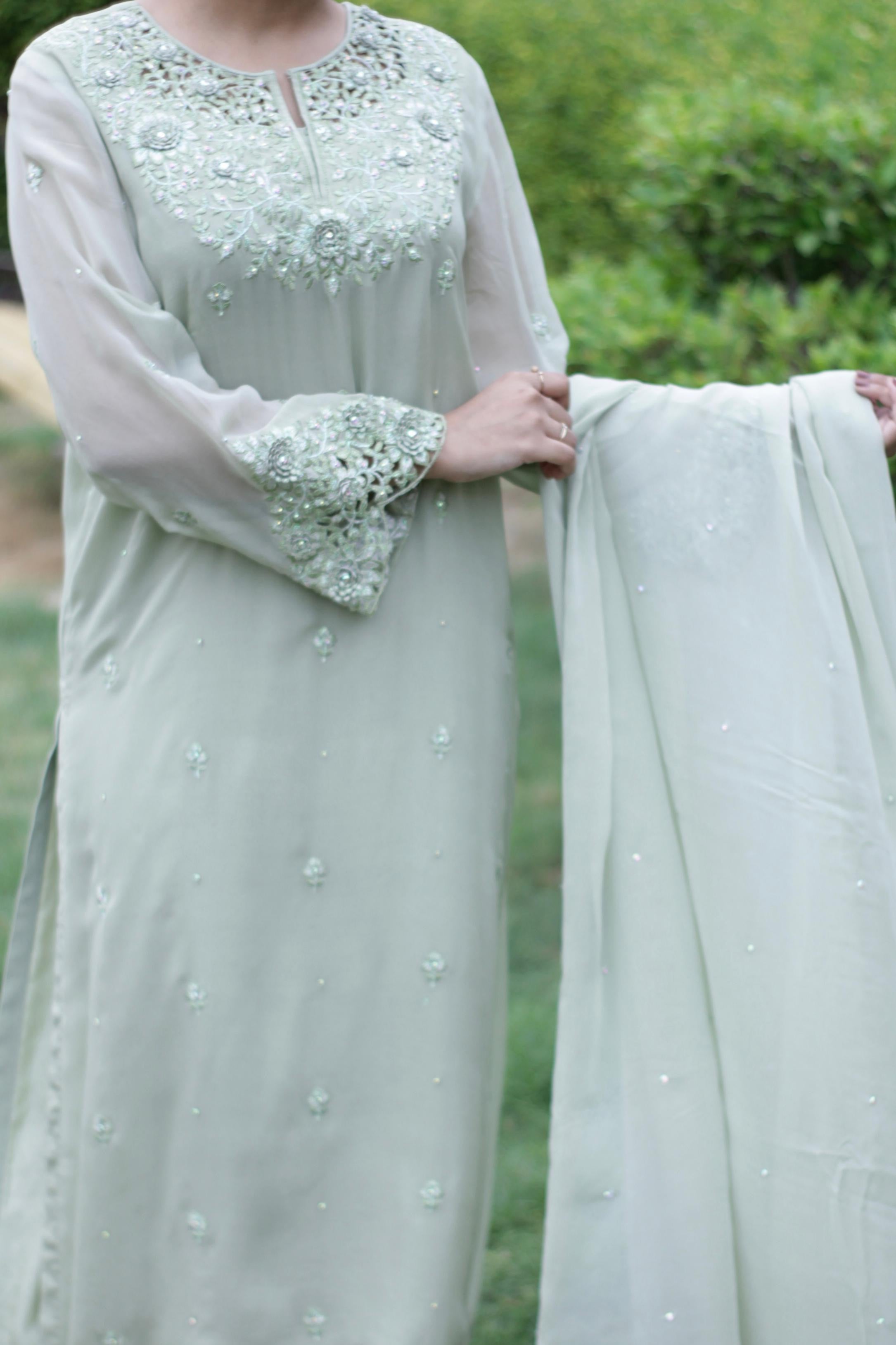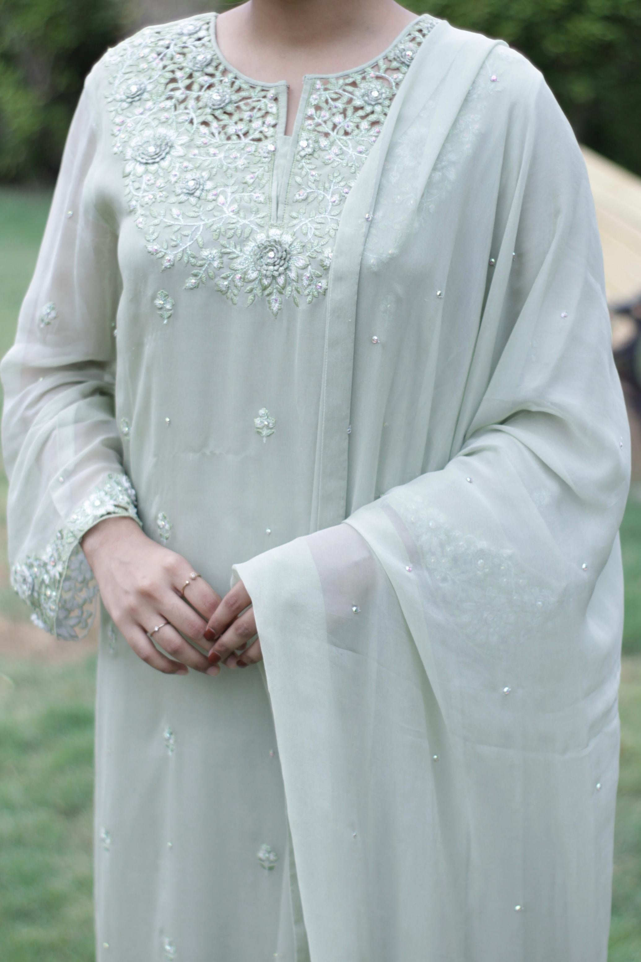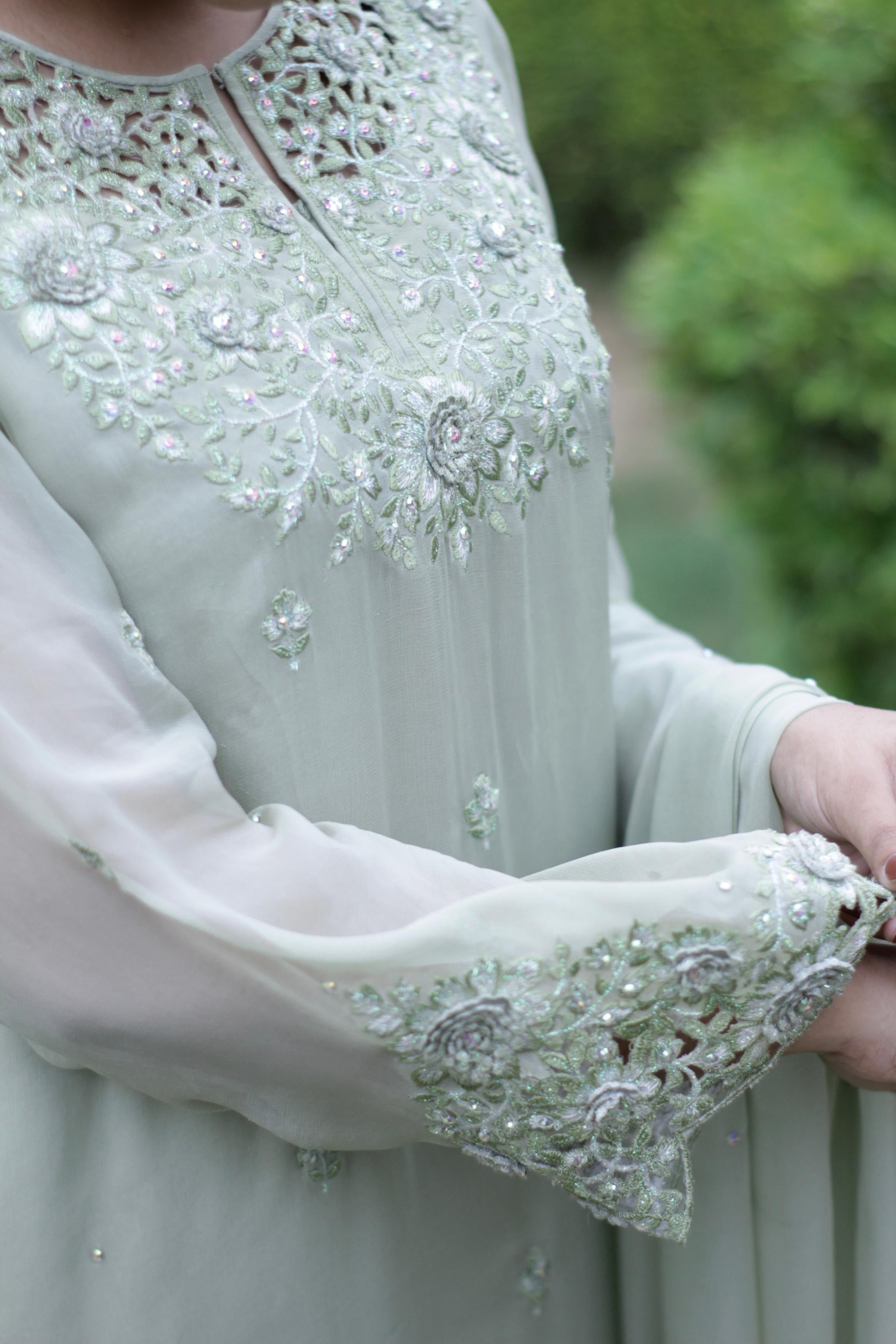 Gul-e-Zaitoon comes in a serene pastel green shade, crafted from pure chiffon for both the shirt and dupatta. The neckline and sleeves are delicately adorned with intricate embroidery, further enhanced by scattered embellishments that add a soft shimmer.